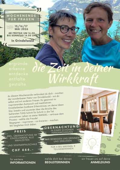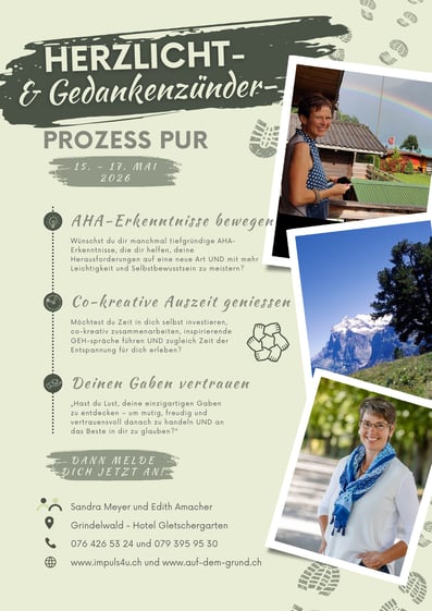 Inmitten der kraftvollen Natur von Grindelwald findest du einen geschützten Raum, um dich mit dir selbst und mit anderen zu verbinden. Durch inspirierenden Austausch, meditative Reflexion und kreative Impulse gewinnst du kostbare Einsichten, die dich ermutigen, deine AHA's Schritt für Schritt mit Herz und Tatkraft umzusetzen.